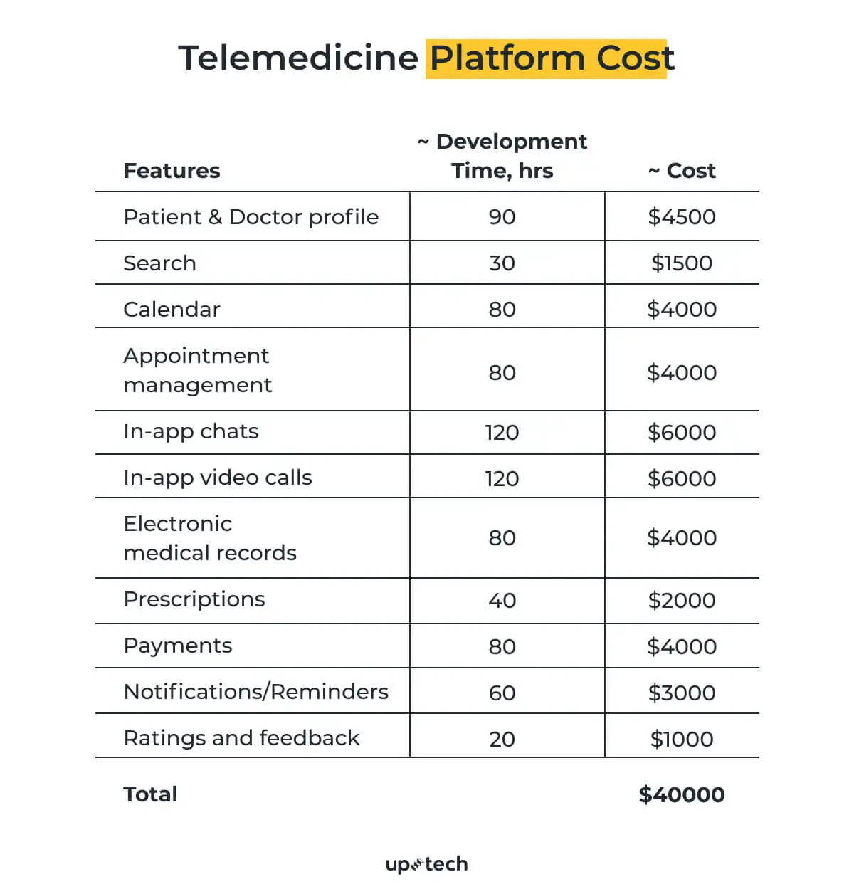 If you want to build a telemedicine platform with features such as online video consultation, appointment scheduler, backend management, and custom interface – the cost will start from $40K, assuming an hourly rate of $50 per hour. This includes the entire development stage, post-release support, product management, and team communication. The price can get higher, up to $80K - $100K.