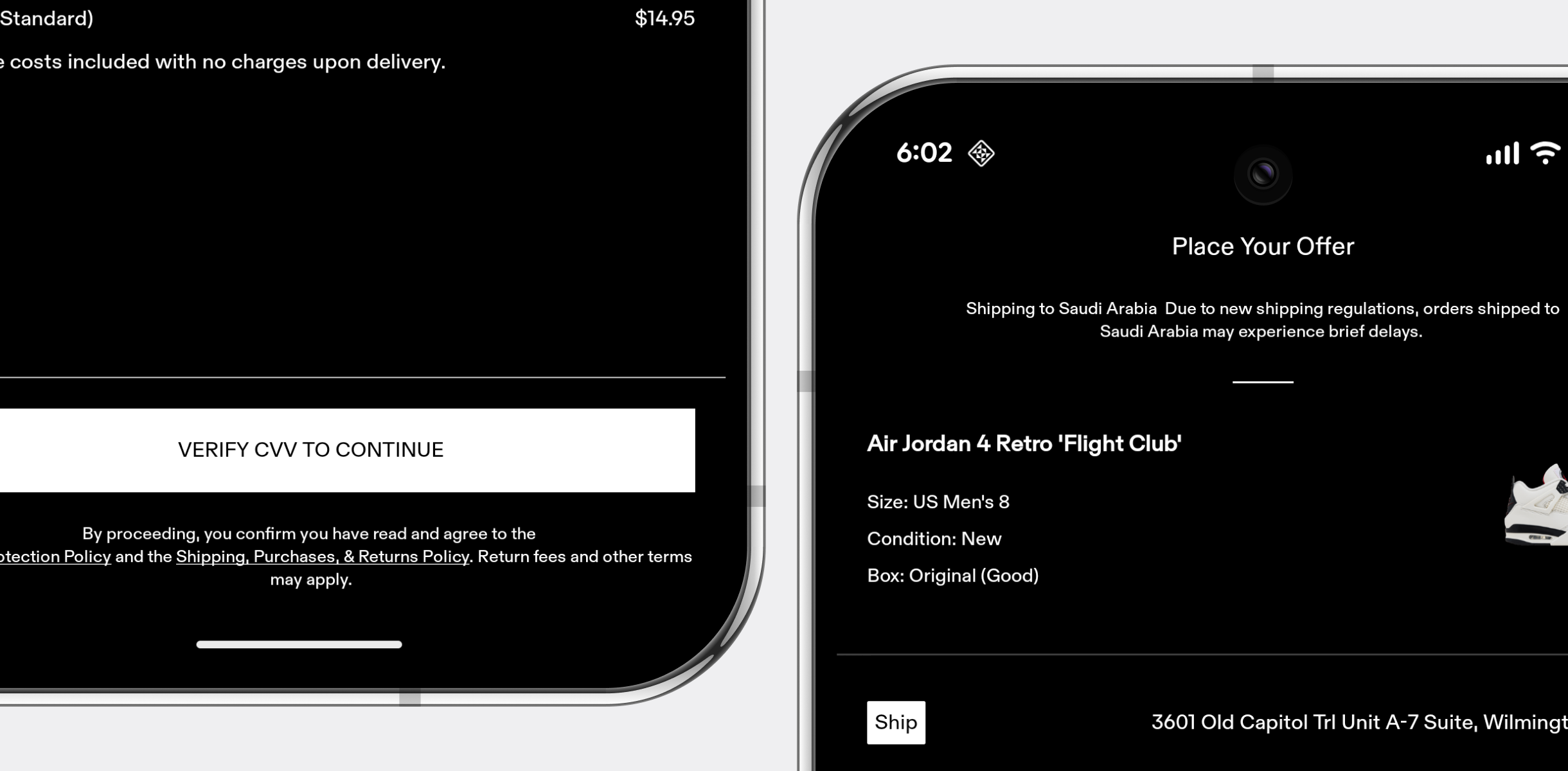 The buying flow supports product selection, size choice, order placement, and order tracking through verification and delivery stages. It reflects GOAT’s complex commerce logic, where items pass through authentication before shipment, and users can follow each order state inside the app.