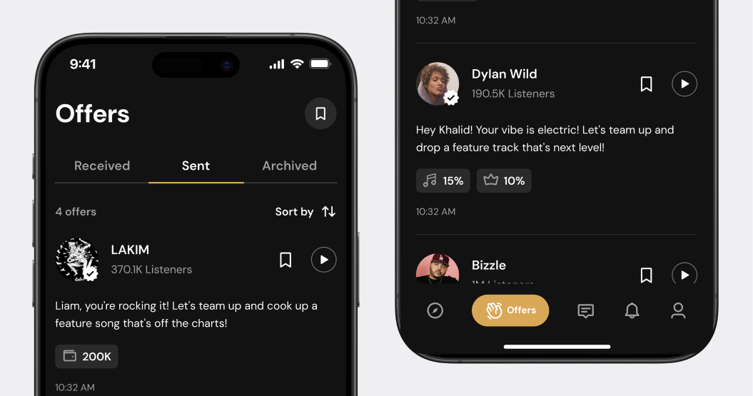 A collaboration platform for music artists available on iOS and the web. The solution helps musicians find collaborators, agree on terms, and sign legally binding documents, which reduces overhead and supports creative work.